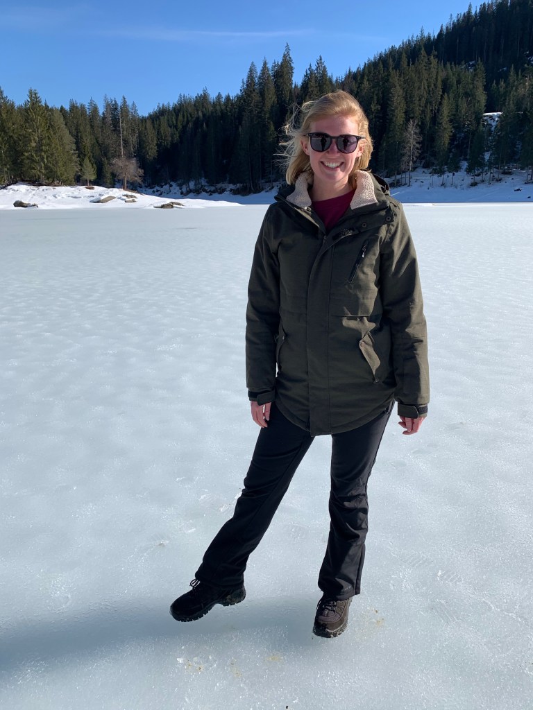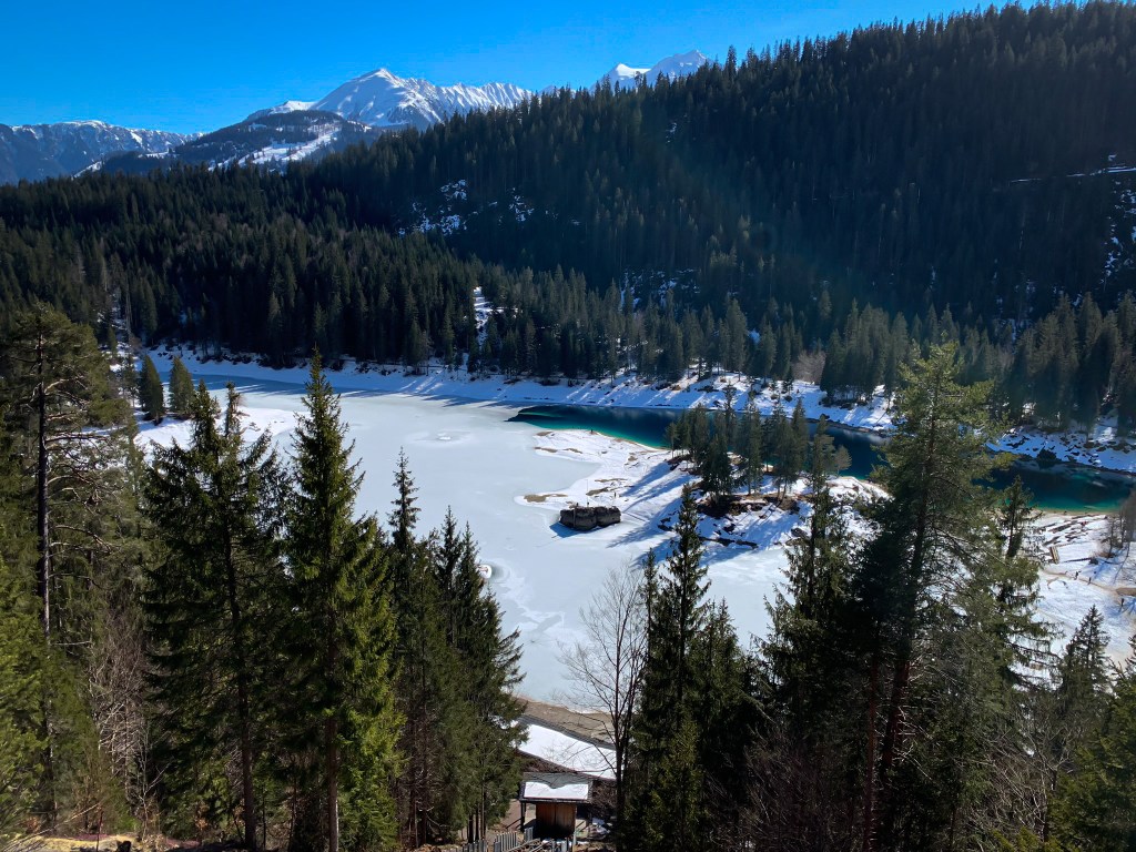 We arrived in Laax, Switzerland on Thursday last week and we were able to enjoy the slopes on Friday. The news that the area would be closed on Monday came as a disappointment, and quite frankly as a surprise, as the entire village and ski area was utterly deserted. When we woke up on Saturday, full of enthusiasm to make the most of the two remaining days, we saw the message that on Friday evening, it was decided to shut down immediately. So that was it. After feeling sad about it for two days, we decided to go for a hike on Monday. We visited the Cauma lake, which was mostly frozen. It was so pretty!