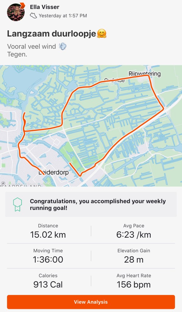 Usually Thursday is track training, but that isn’t happening. So I go for a run myself. I head out the door right away when I wake up, but for the first time ever, I notice I might have had too little to eat. I feel exhausted after 6km and I can only get myself to run 9.5 instead of the planned 11. After refuelling with some breakfast, I feel better! Not a good run, but a good lesson nonetheless.