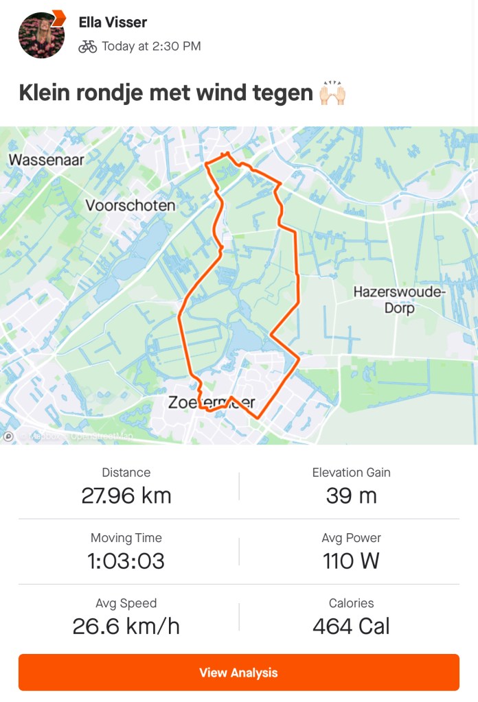 No running planned, so I decide to grab my lovely new bike and head out the door for a solo ride. Usually I go with Wouter, but today I’m feeling like exploring the surroundings by myself. Bad idea it turns out! Wouter always checks the wind to make sure we start with head wind and end with tail wind. I didn’t… So that was a challenge getting home hahaha!